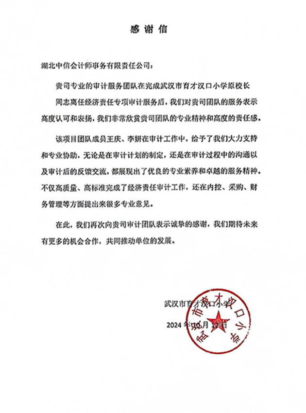 武汉市育才汉口小学感谢信