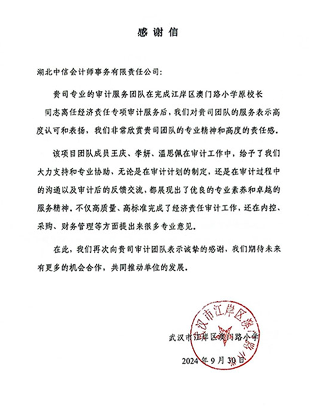武汉市江岸区澳门路小学感谢信