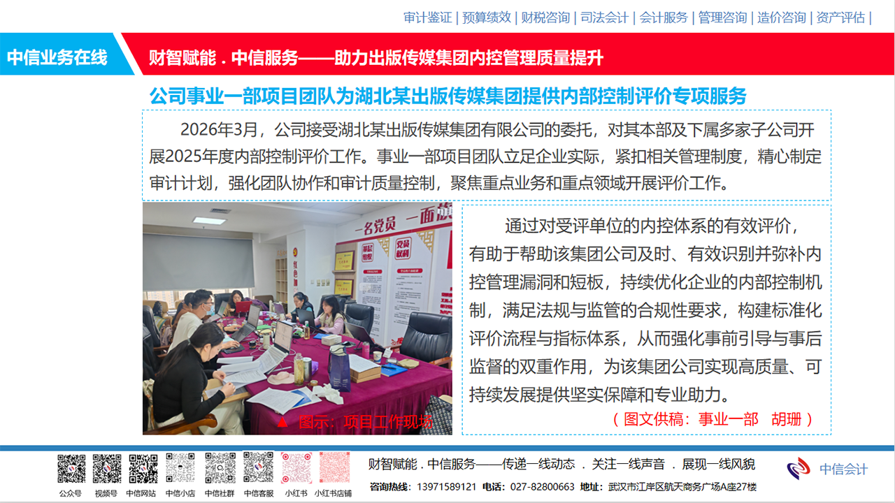 04/102026公司事业一部项目团队为湖北某出版传媒集团提供内部控制评价专项服务