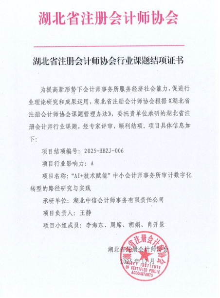 湖北中信会计师事务所承研的2025年湖北省注册会计师协会行业课题顺利结项